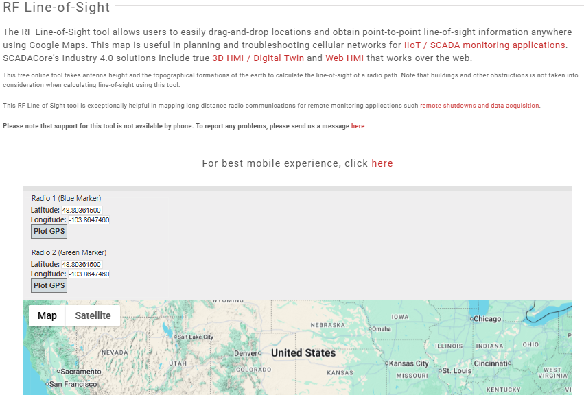 An external RF Line-of-Sight tool that allows users to easily drag-and-drop locations and obtain point-to-point line-of-sight information anywhere using Google Maps <mobile link>